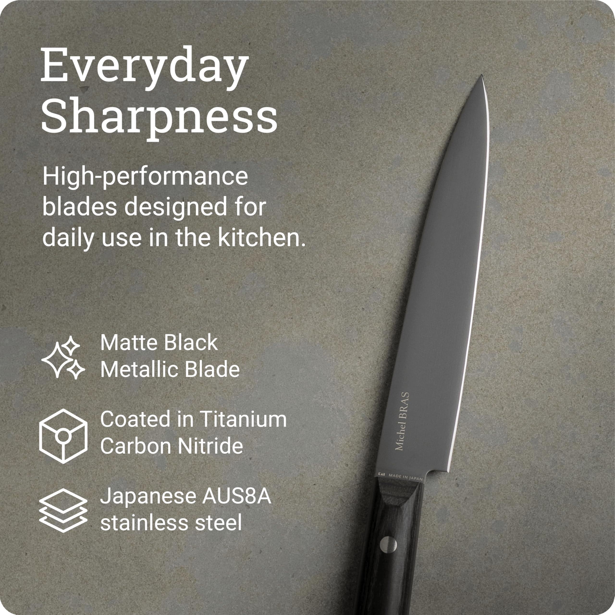 - BRILLIANT SHARPNESS: Made with Japanese AUS8A stainless steel for superior durability and coated in titanium carbon nitride, the matt black metallic blade delivers lightweight precision.