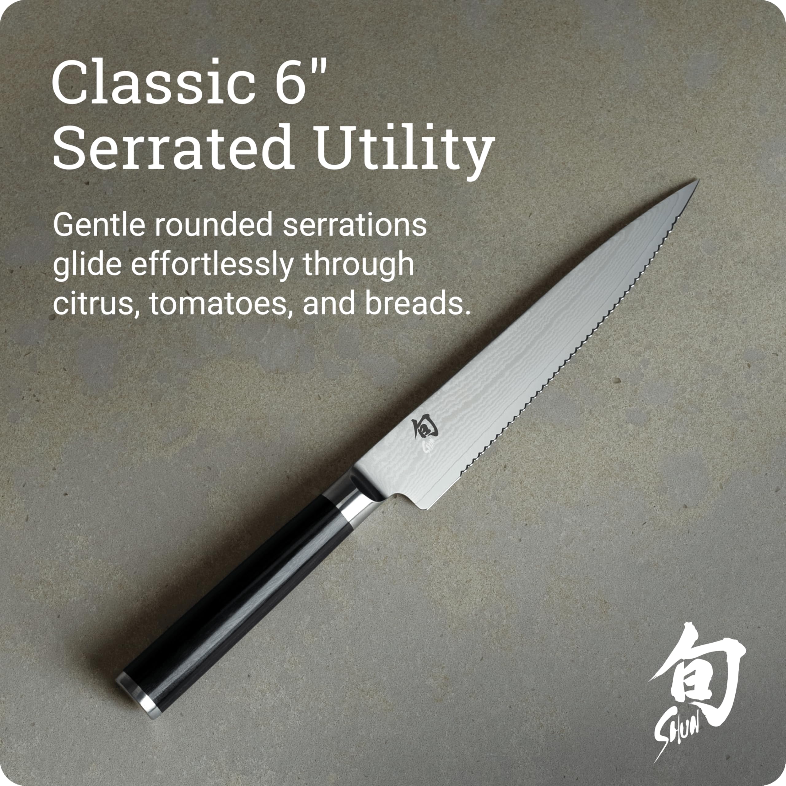 - SERRATED KITCHEN UTILITY KNIFE: The Shun Classic 6-inch Serrated Utility Knife is expertly designed for multipurpose use where precise cuts are needed, making it a must-have for any kitchen.