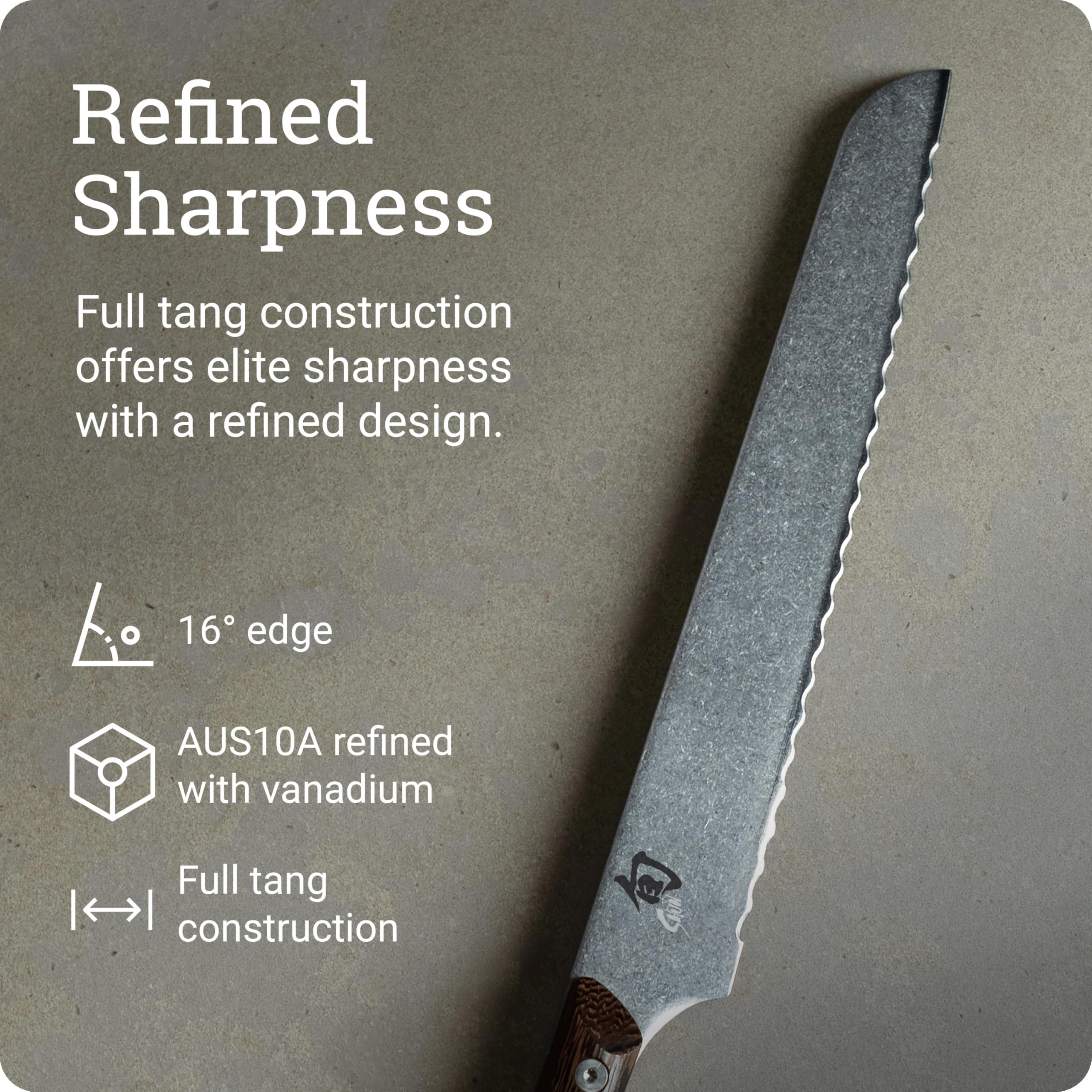 - SERRATED BREAD KNIFE: The Shun Kanso 9-inch Bread Knife is expertly designed for cutting bread with ease. Wide teeth slice through tender and crusty bread alike with no ripping, squashing or tearing.