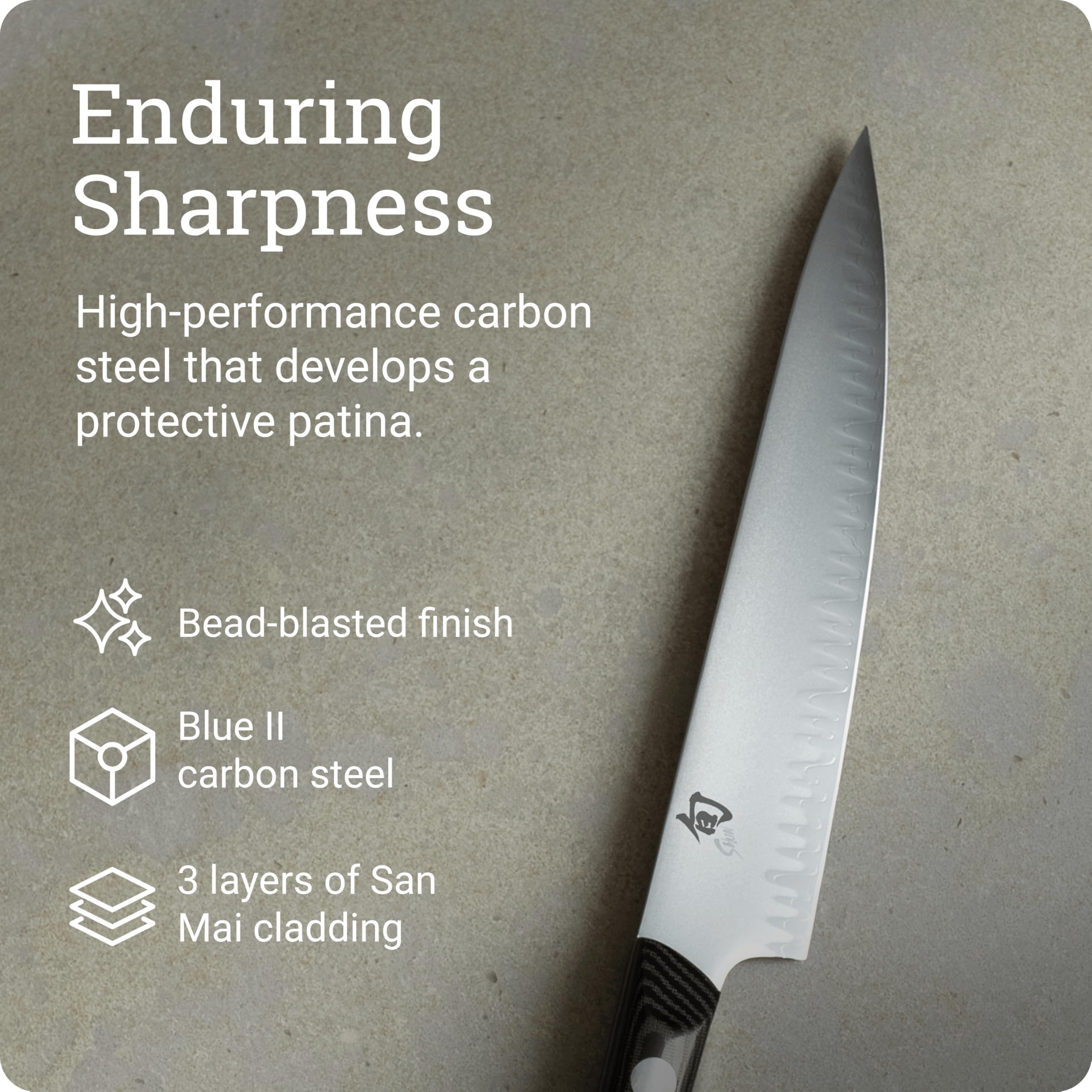 - PREMIUM SHARPNESS: Crafted with Blue II carbon steel and San Mai stainless steel cladding, this knife features a fine edge with razor-sharp precision. Bead-blasted finish hides scratches and helps release food.