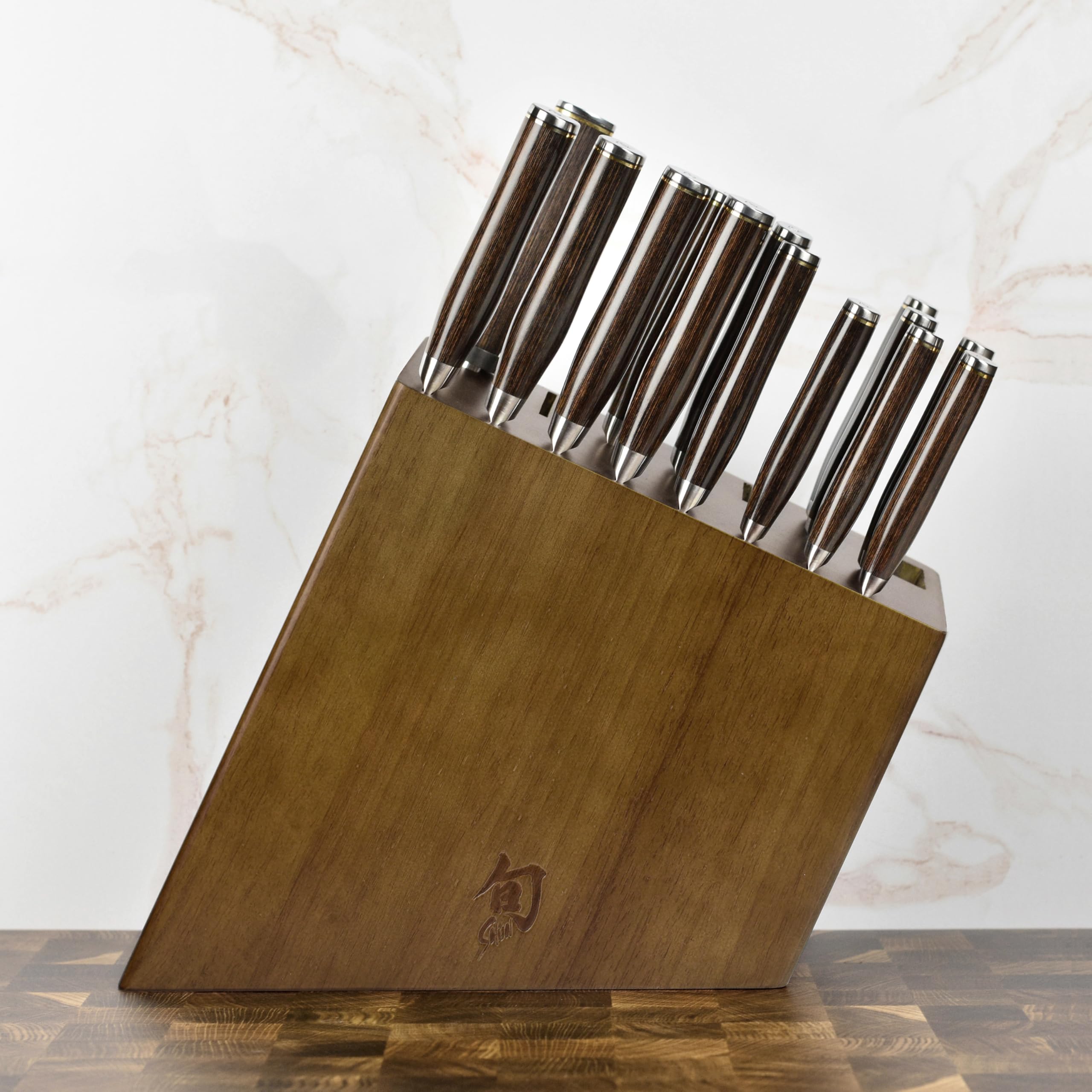 - Shun Knife Set Includes: 4" Paring Knife, 5.5" Nakiri Knife, 6" U2 Ultimate Utility Knife, 6" Curved Boning/Fillet Knife, 6.5" Utility Knife, 7" Santoku Knife, 8" Chef's Knife, 9" Bread Knife, 9.5" Slicing Knife, Four 5" Steak Knives, 9" Combination Honing Steel & 17 Slot Angled Knife Block