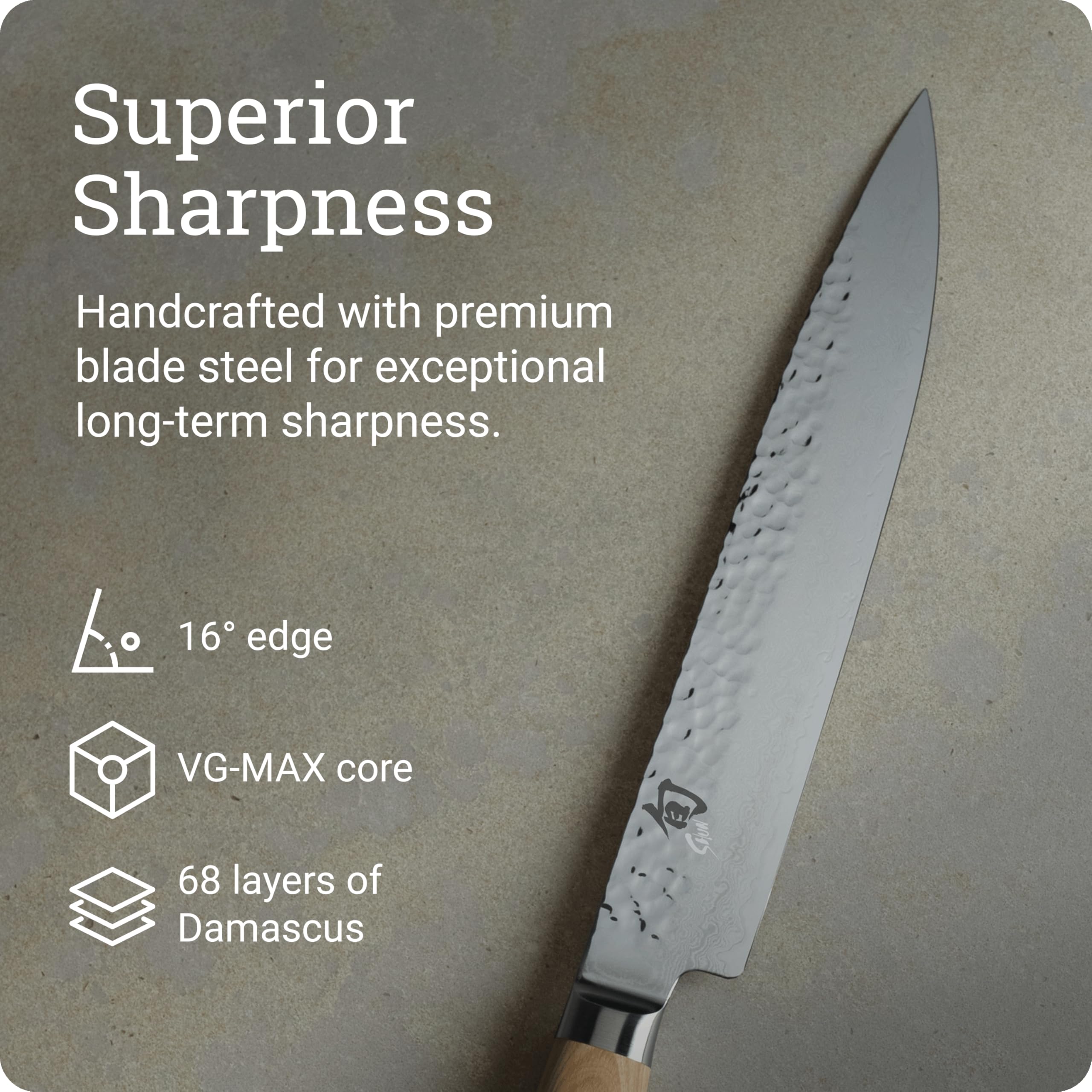- JAPANESE CRAFTSMANSHIP: Each Shun knife is meticulously handcrafted in Japan, reflecting a legacy of traditional knife-making expertise and a dedication to superior quality. Supported by free sharpening and honing.