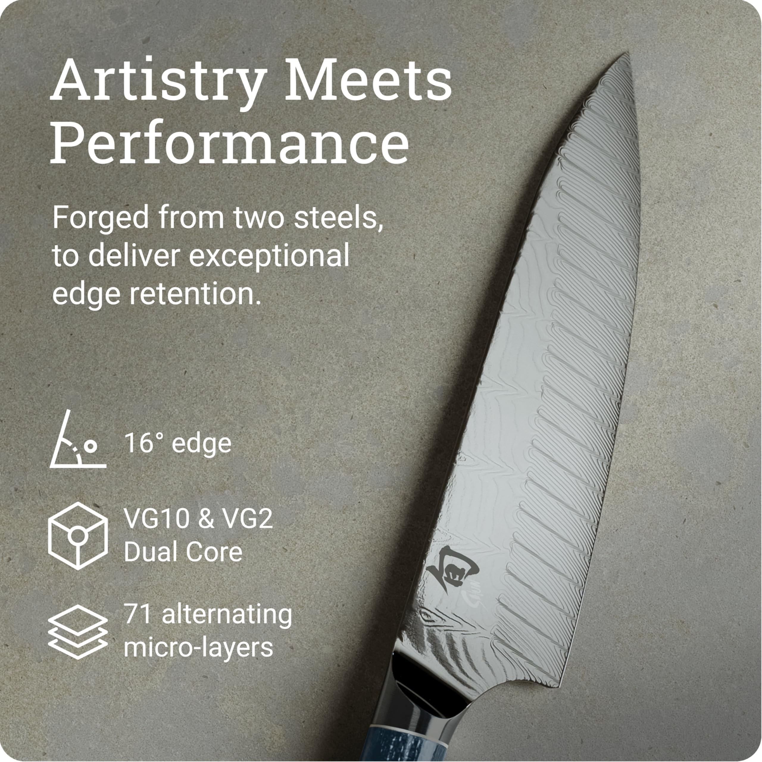 - Dual core construction; 71 alternating micro-layers of VG10 and VG2, high-carbon, high-chromium stainless steel extend all the way to the edge