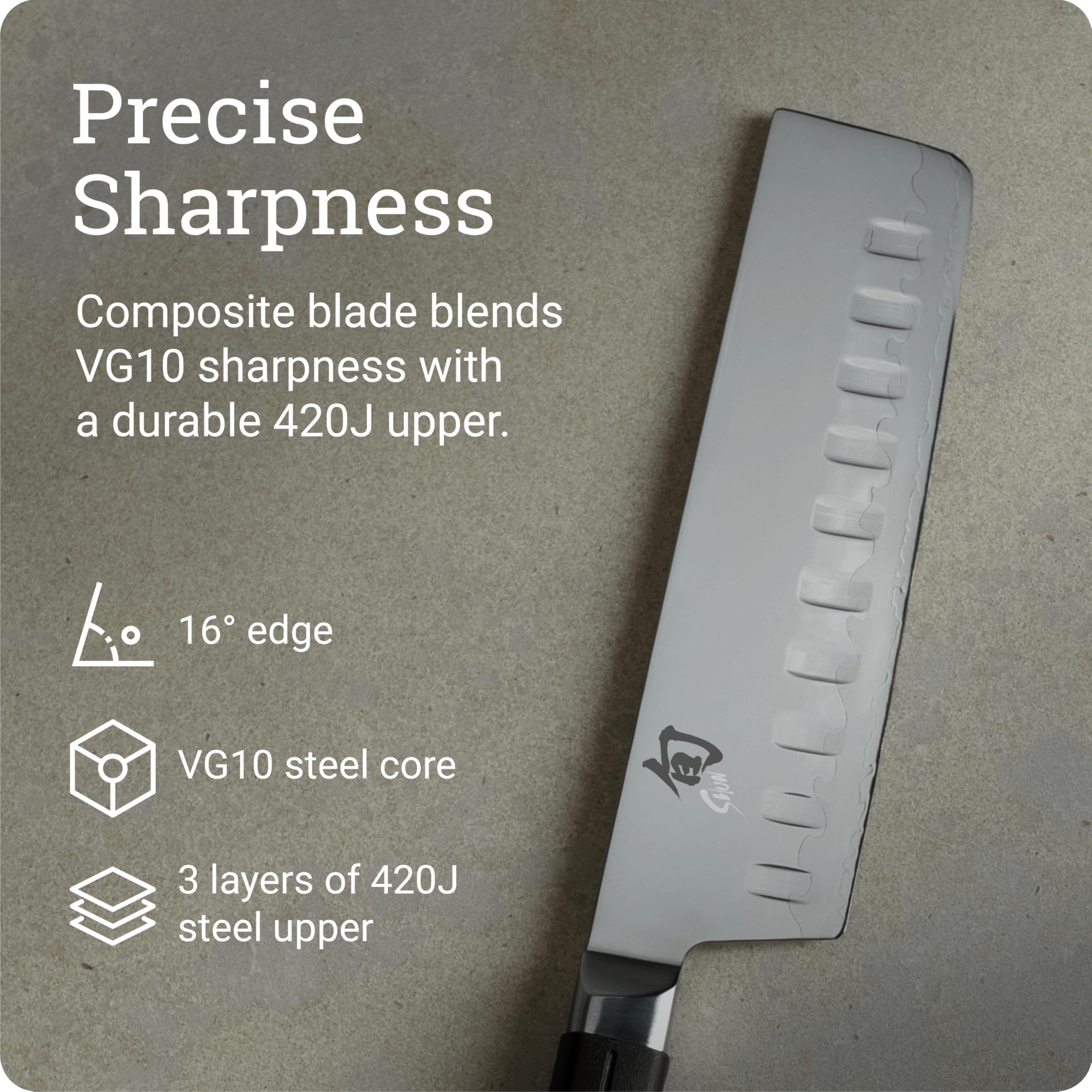 - PRECISE SHARPNESS: San Mai edge construction features VG10 steel supported by a 420J stainless steel blade upper for razor-sharp precision with a 16-degree edge. Features hollow ground indentations for food release and friction reduction.